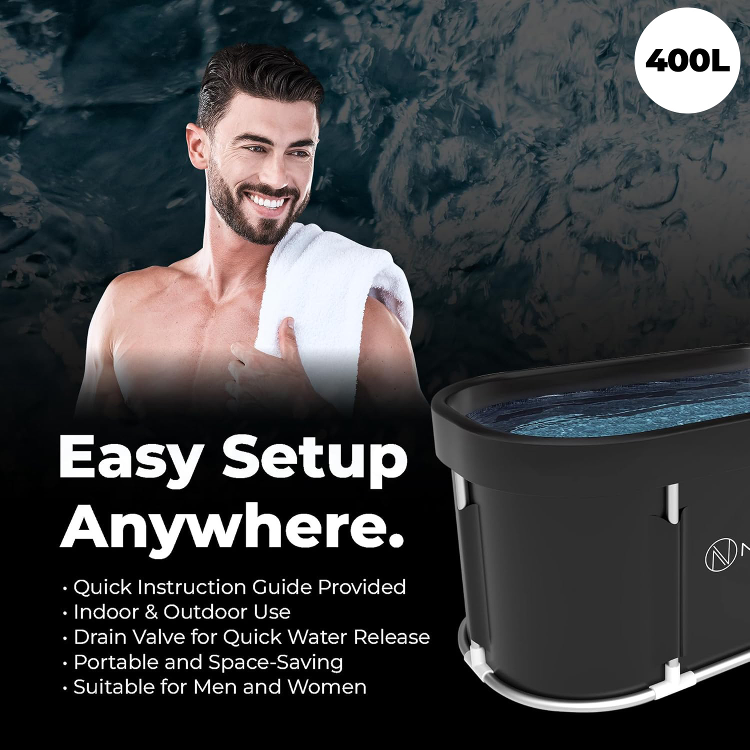 Easy-to-move ice bath tub design for versatile placement; lightweight yet sturdy construction; perfect cold plunge pool, outdoor bathtub, and portable bathtub for adults; simple setup with pole system and drainage tap system.